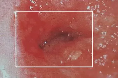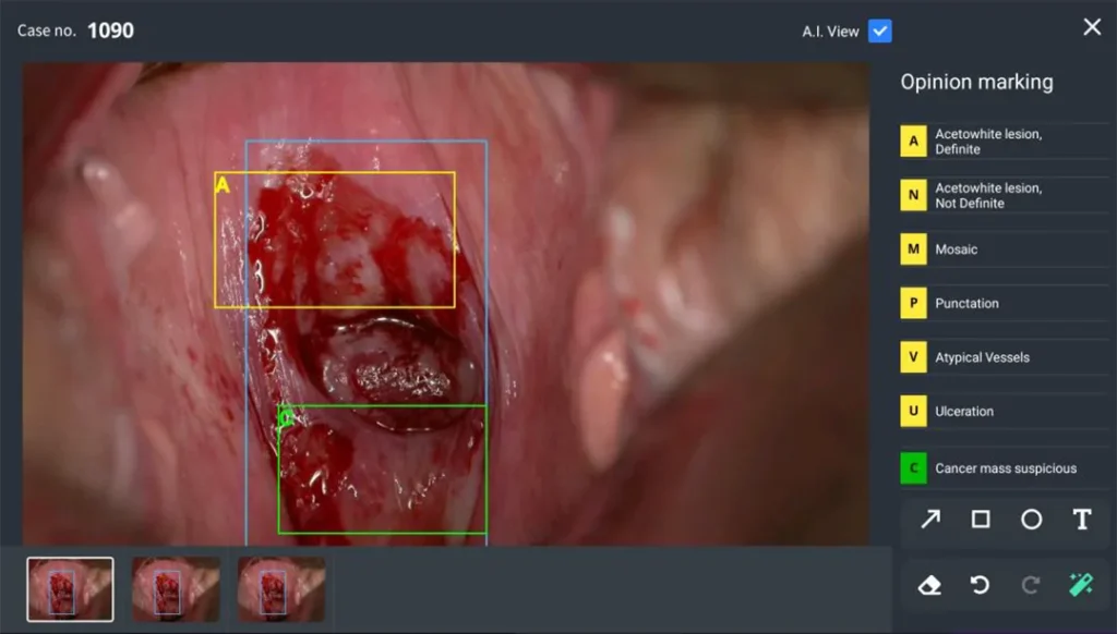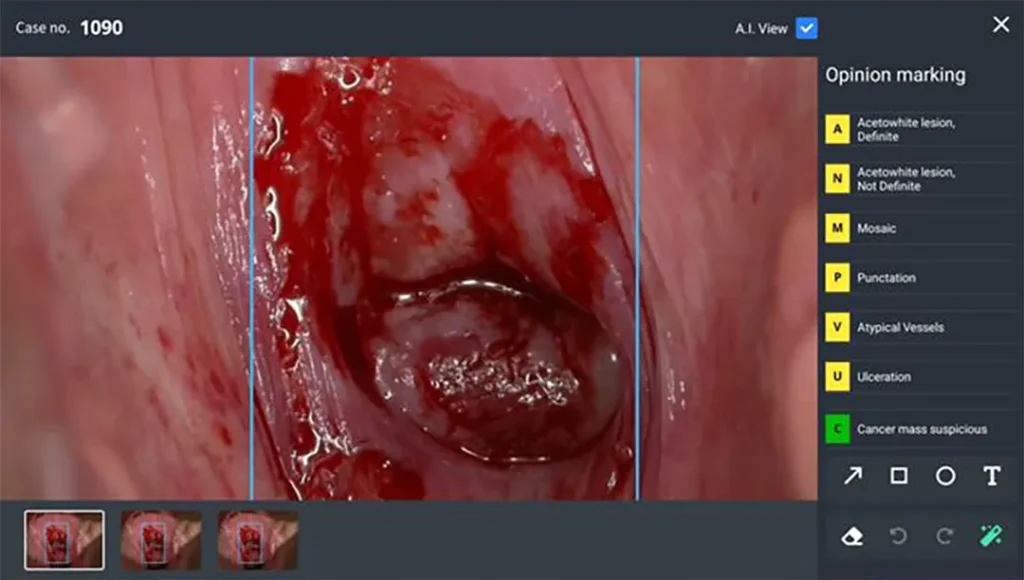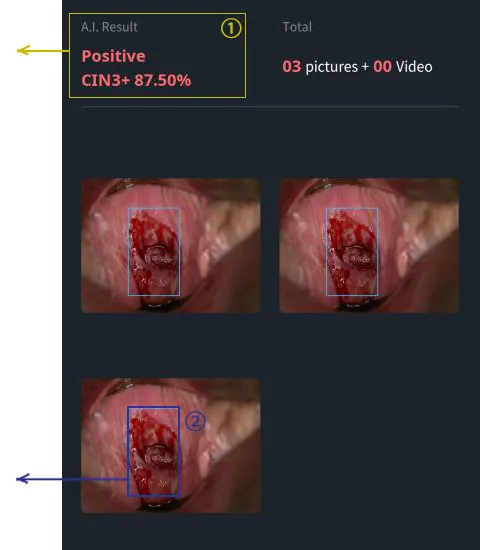 ② Зурган дээрх цэнхэр хүрээ нь Cerviray A.I.-ийн шинжилгээний үр дүнд хорт хавдрын сэжигтэй бүс гэж дүгнэгдсэн хэсгийг ялган үзүүлж байна.