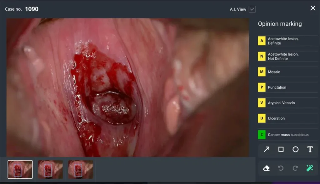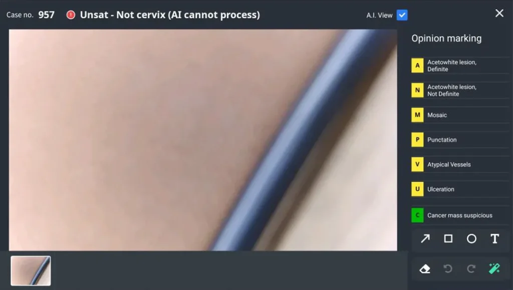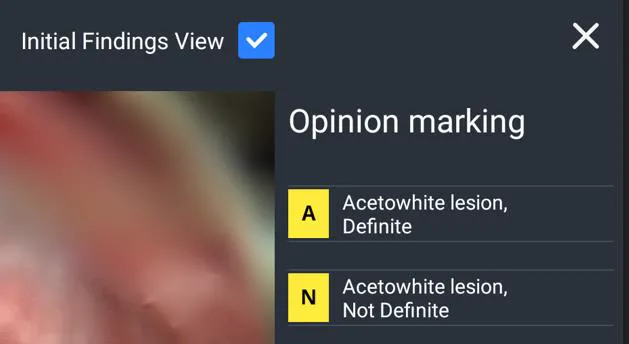 Ямар ч тэмдэглэгээг харуулахгүй Зөвхөн тодорхой дүрсийг шалгахын тулд 'A.I. Result' товчлуурыг сонгохгүй байж болно. Эсвэл Cerviray кольпоскопоор ямар нэгэн эмгэг илрээгүй бол зураг дээр ямар ч тэмдэглэгээ байхгүй байж болно.