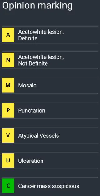 • Хэрэглэгчид шар өнгөтэй тэгш өнцөгт дүрс бүхий 6 тэмдэглэгээний хэсгийг  нэмэх боломжтой бөгөөд тэмдэглэгээ нь дээрх хүснэгтийн дагуу зүүн дээд буланд харагдах болно. Хэрэв хорт хавдар байж болох сэжигтэй байгаа бол ногооноор сонгож тэмдэглэнэ.
