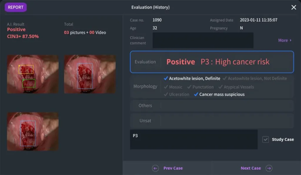 • Програм хангамжаас илгээсэн зургуудыг AI үр дүн гэсэн хэсэг дээр харуулдаг. Үнэлгээний хуудасны зүүн дээд талд байрлах AI үр дүн нь умайн хүзүүний эпителийн неоплази (CIN) зэрэг болон түүний магадлалыг хувиар бодон харуулдаг. AI үр дүн нь кольпоскопийн шинжилгээний эцсийн үр дүн биш бөгөөд эцсийн үр дүнг гаргахын тулд эмч/клиникчийн зүгээс өвчтөний үнэлгээний хуудсыг бүрэн бөглөнө. CIN зэрэг нь эмчийн үнэлгээнд ашиглах үнэлгээний хэсэгт P1-ээс P3 гэж тэмдэглэгдсэн байдаг ба P зэрэглэлийн нарийвчилсан тайлбар нь дараах байдалтай байна: