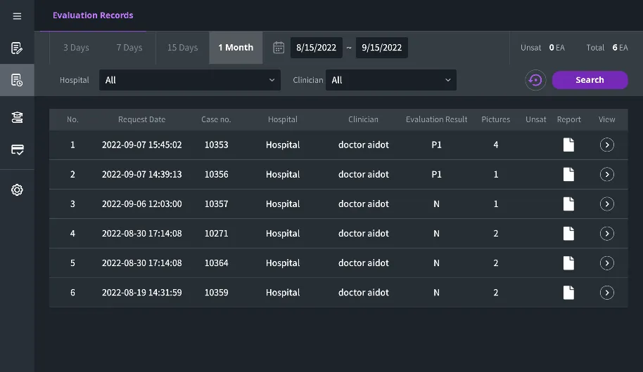 Сонгосон хугацаа, эмнэлгийн нэр эсвэл эмчийн нэр дээр үндэслэн үнэлгээний түүхийг хайх боломжтой бөгөөд тухайн тохиолдол бүрт [View] товчийг дарж доорх [Зураг 63] үнэлгээний түүхийн хуудсыг үүсгэснээр үнэлгээний үр дүнг баталгаажуулах боломжтой.